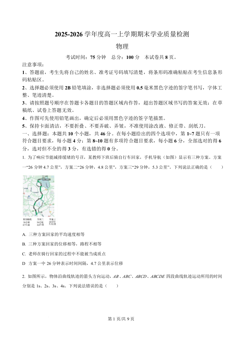 高一物理+答案--吉林省延边朝鲜族自治州2025-2026学年高一上学期期末