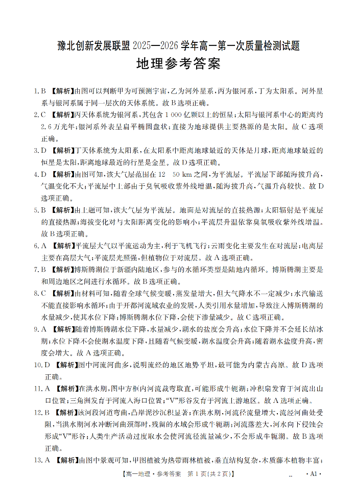 高一地理答案--河南省豫北创新发展联盟2025-2026学年高一上学期第一次质量检测试题