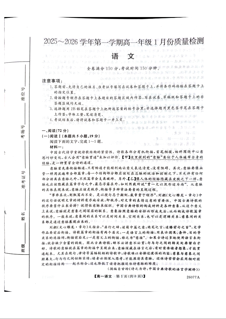 高一语文--河北省石家庄市七县联合体2025-2026学年高一上学期1月月考