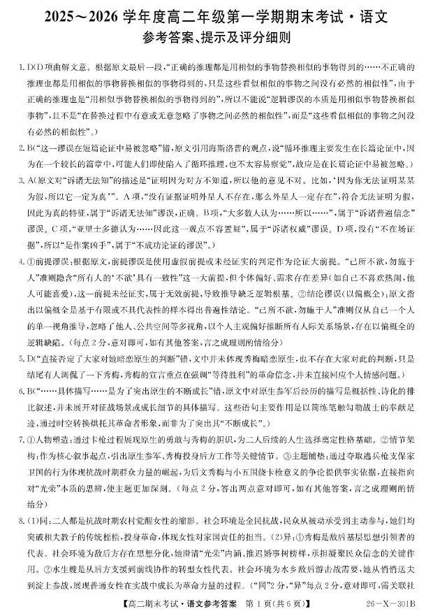 高二语文答案--黑龙江省龙东十校联盟2025-2026学年高二上学期期末考试