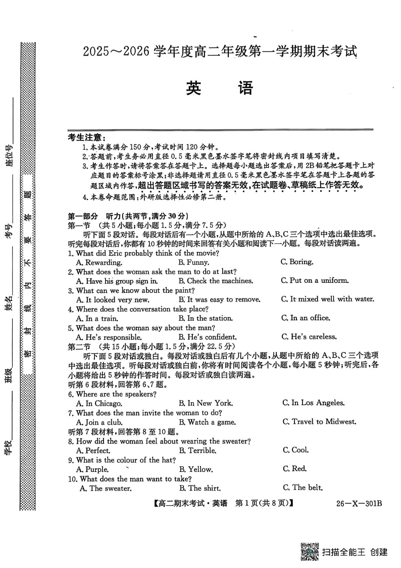高二英语--黑龙江省龙东十校联盟2025-2026学年高二上学期期末考试