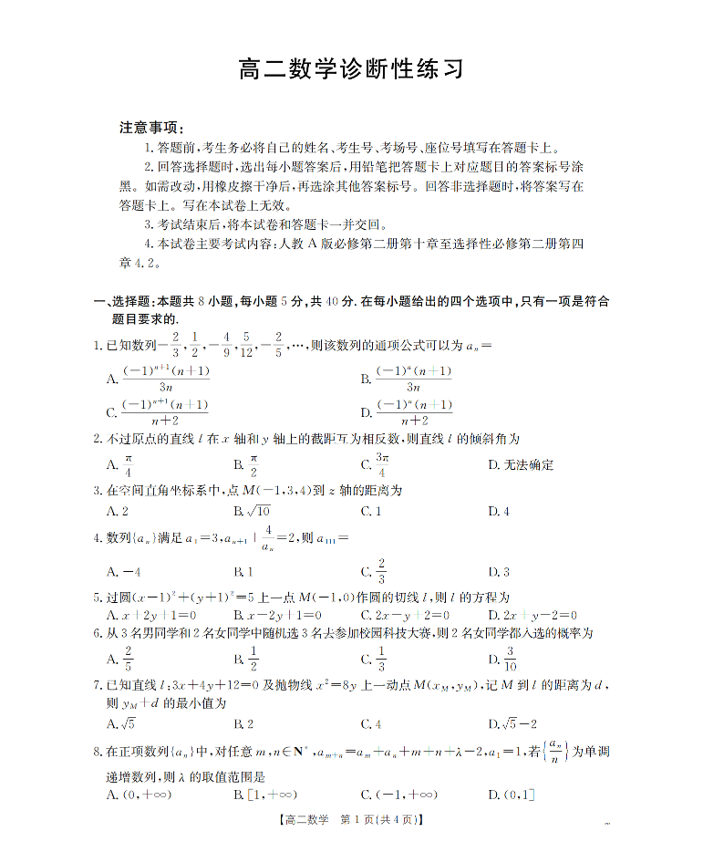 高二数学--山东省济宁市2025-2026学年高二上学期1月诊断性练习月考