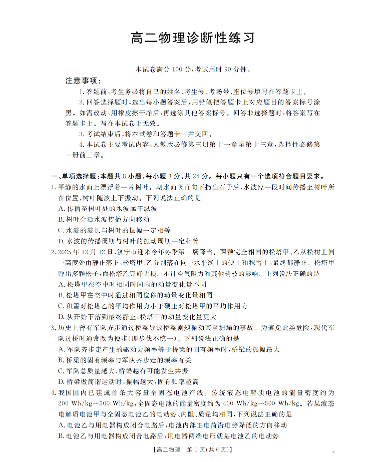 高二物理--山东省济宁市2025-2026学年高二上学期1月诊断性练习月考