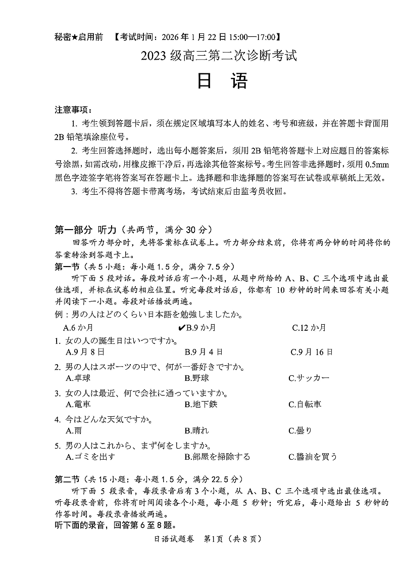 高三日语--四川省“元三维大联考”2023级高三第二次诊断考试(绵阳二诊B)