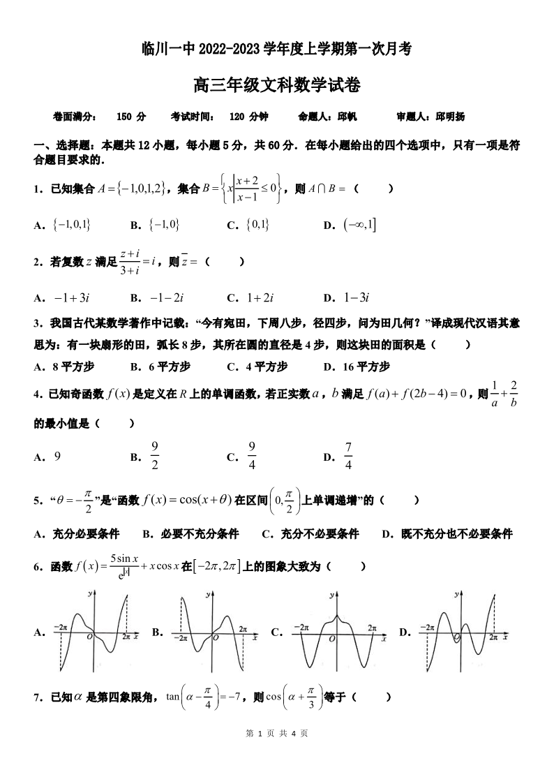 高三文数--江西省临川第一中学2023高三上学期第一次月考