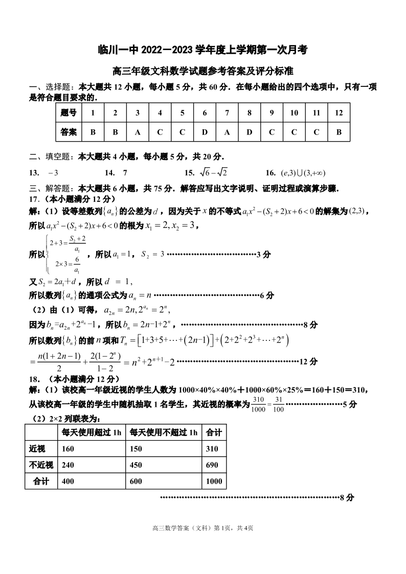 高三文数答案--江西省临川第一中学2023高三上学期第一次月考
