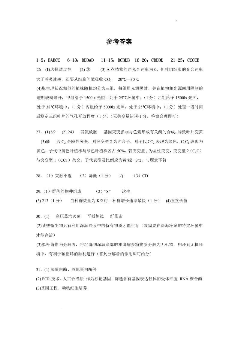 高三生物答案--江西省临川第一中学高三上学期10月期中