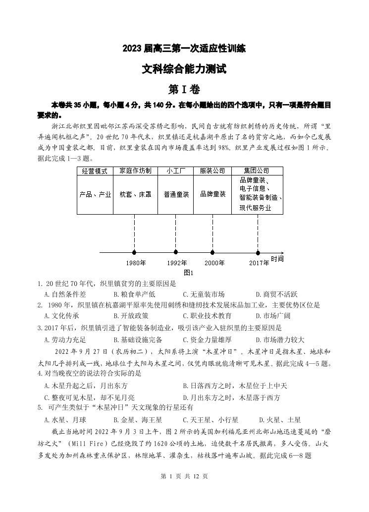 高三文综--陕西省西安市西北工业大学附属中学2022-2023学年高三上学期第一次适应性训练