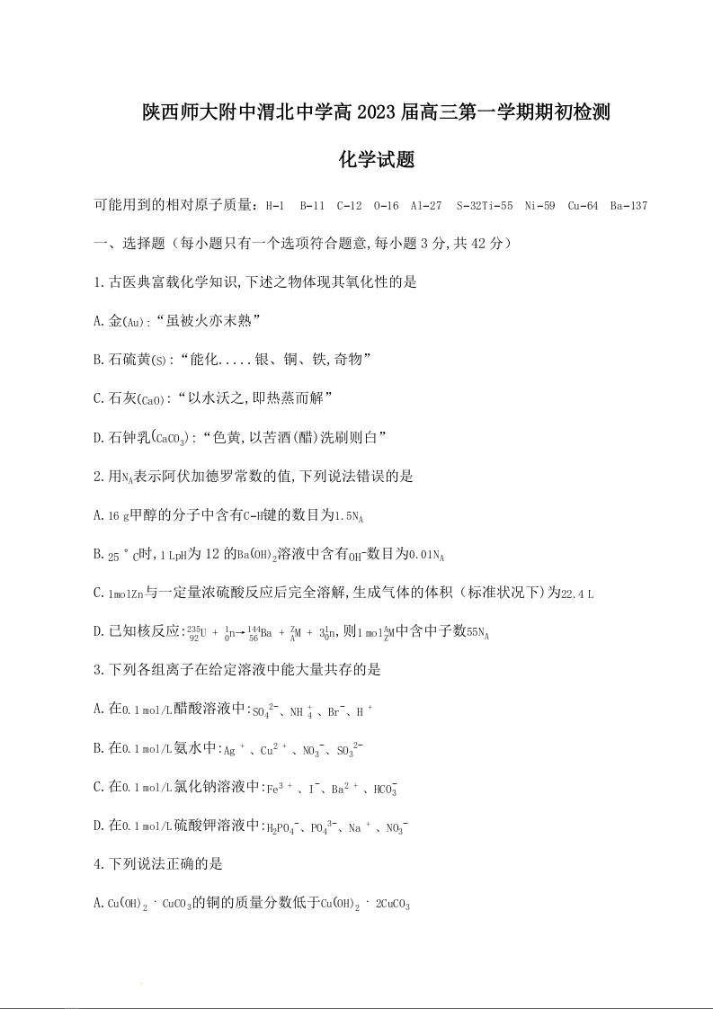 高三化学--陕西师范大学附属中学、渭北中学等2023高三上学期期初检测