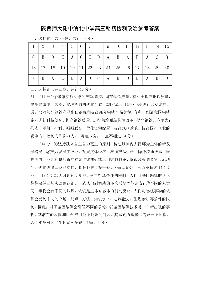 高三政治答案--陕西师范大学附属中学、渭北中学等2023高三上学期期初检测