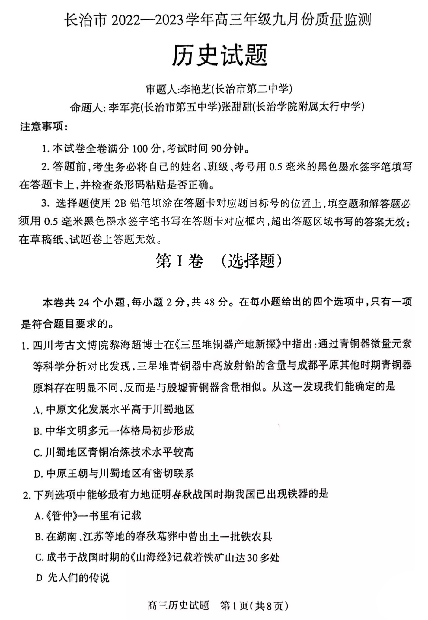 高三历史--山西省长治市23届高三9月质检