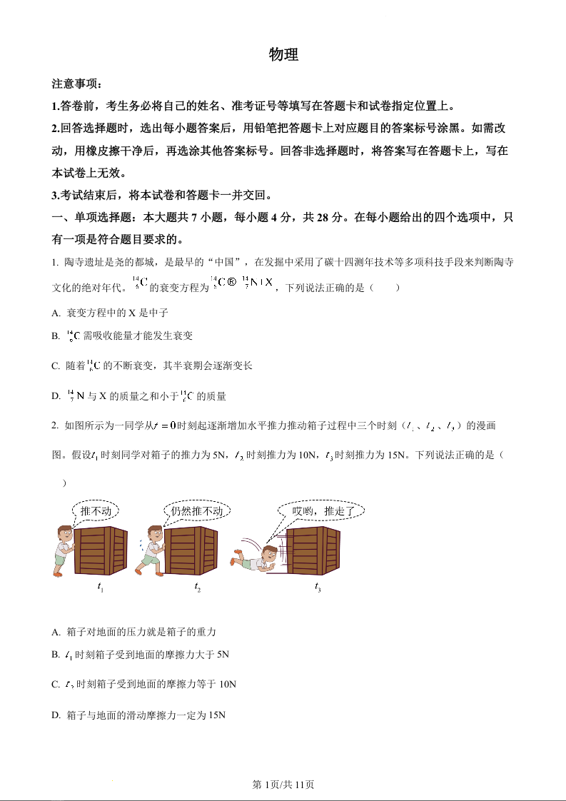 高三物理+答案--山西省运城市2023高三年级入学新生教学质量监测考试