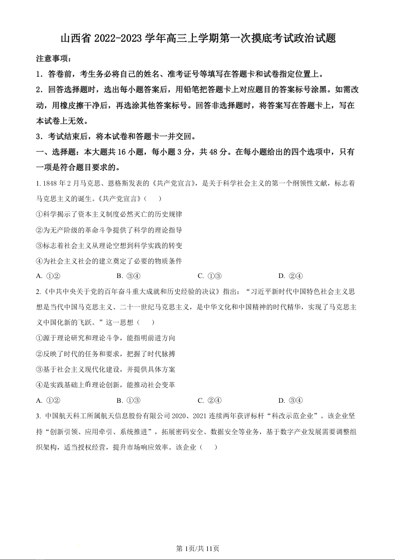 高三政治--山西省运城市2023高三年级入学新生教学质量监测考试