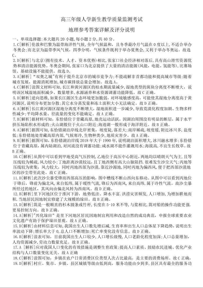 高三地理答案--山西省运城市2023高三年级入学新生教学质量监测考试