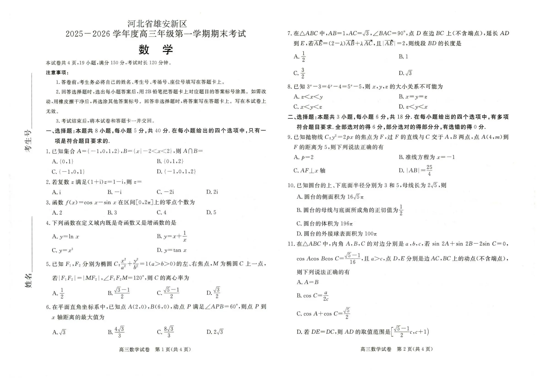 高三数学--河北省雄安新区202届高三年级第一学期1月期末考试