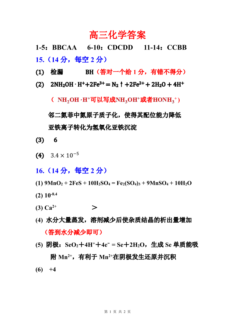 高三化学答案--江西省五市十校协作体2026届高三上学期1月期末阶段性作业
