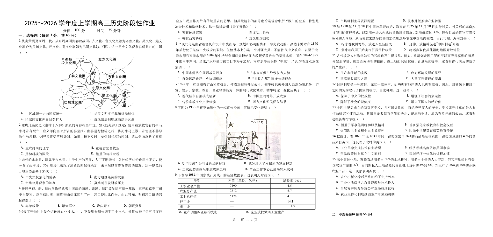 高三历史--江西省五市十校协作体2026届高三上学期1月期末阶段性作业