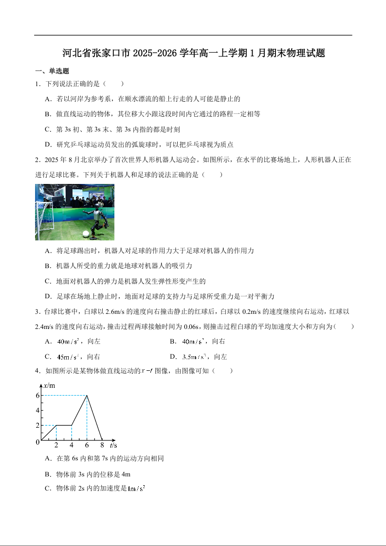 高一物理+答案--河北省张家口市2025-2026学年高一上学期期末教学质量监测