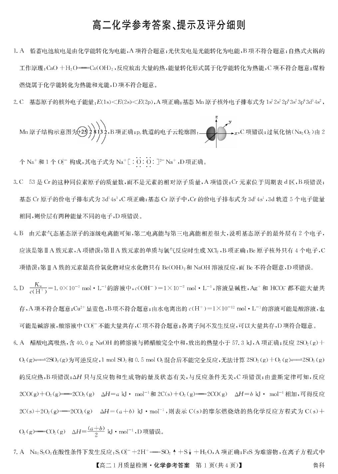 高二化学答案(鲁科)--江西省多校联考2025-2026学年高二上学期1月期末联考
