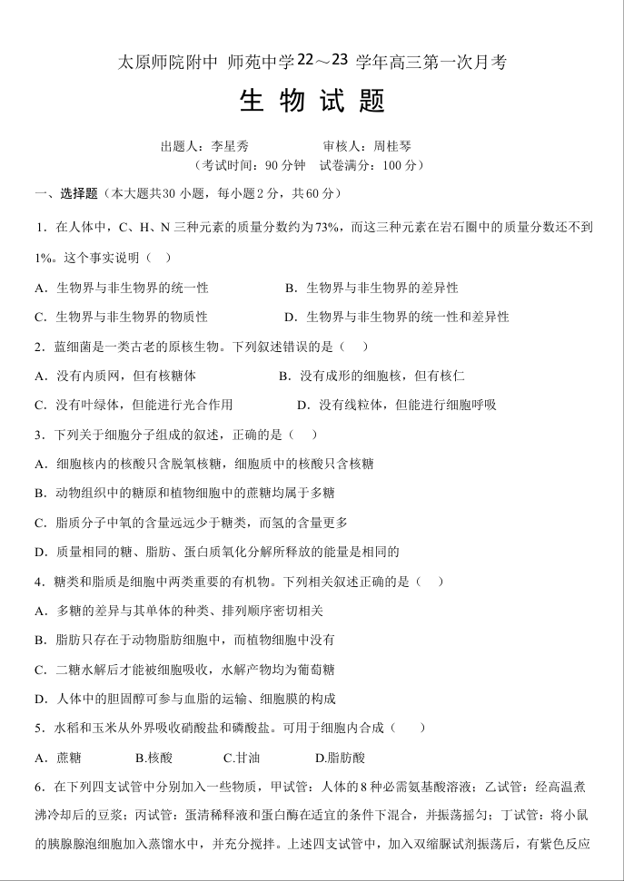 高三生物--山西省太原师范学院附属中学23届高三上学期第一次月考