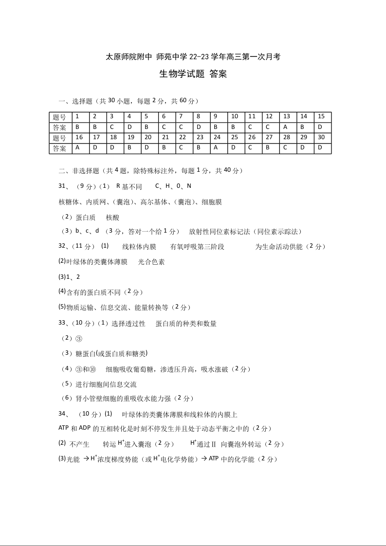 高三生物答案--山西省太原师范学院附属中学23届高三上学期第一次月考