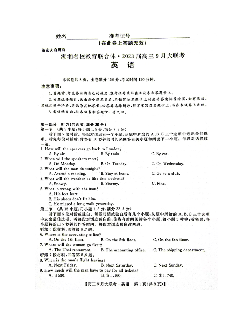 高三英语--湖湘名校教育联合体2023高三9月大联考