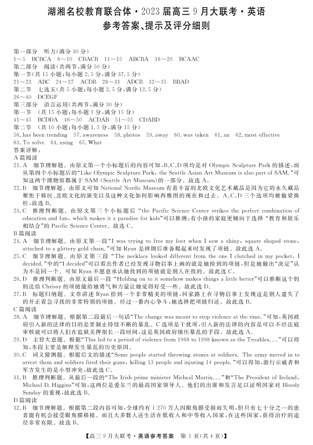 高三英语答案--湖湘名校教育联合体2023高三9月大联考