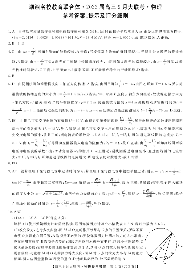 高三物理答案--湖湘名校教育联合体2023高三9月大联考