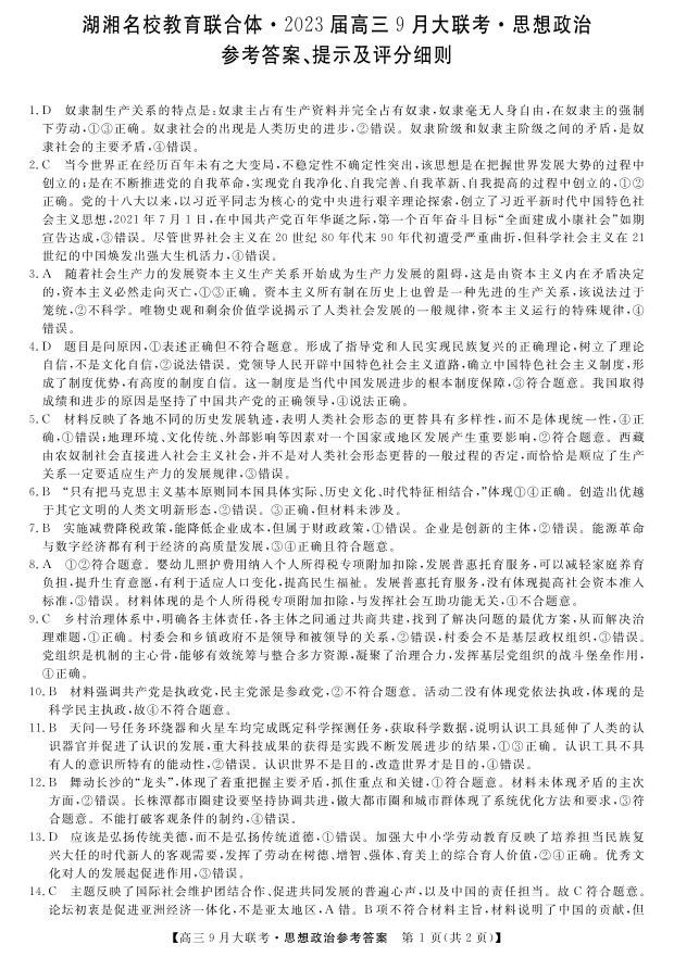高三政治答案--湖湘名校教育联合体2023高三9月大联考