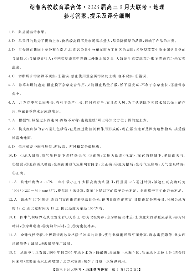 高三地理答案--湖湘名校教育联合体2023高三9月大联考
