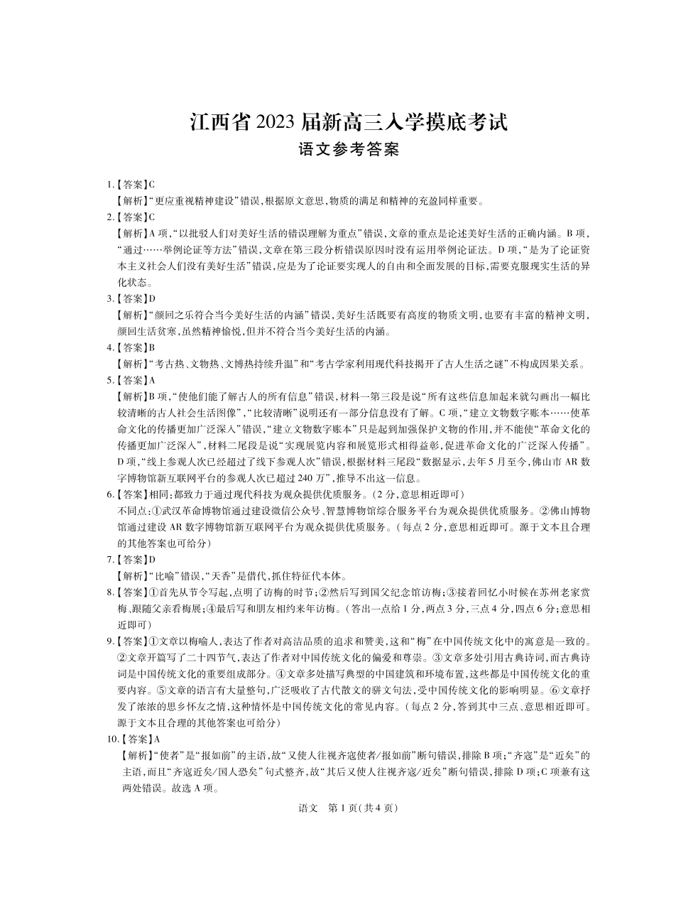 高三语文答案--江西省智慧上进2023新高三上学期入学摸底考试