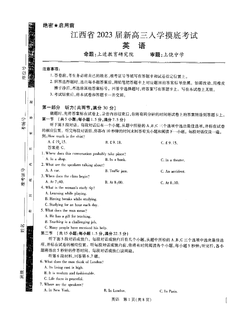高三英语--江西省智慧上进2023新高三上学期入学摸底考试