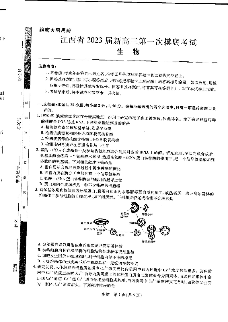高三生物--江西省智慧上进2023新高三上学期入学摸底考试