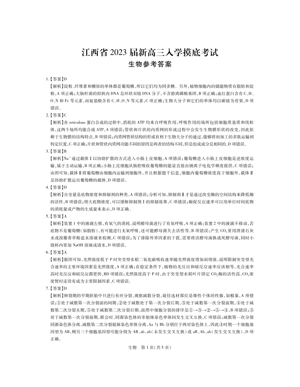 高三生物答案--江西省智慧上进2023新高三上学期入学摸底考试