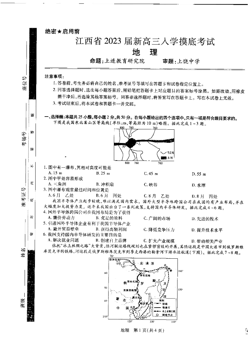 高三地理--江西省智慧上进2023新高三上学期入学摸底考试