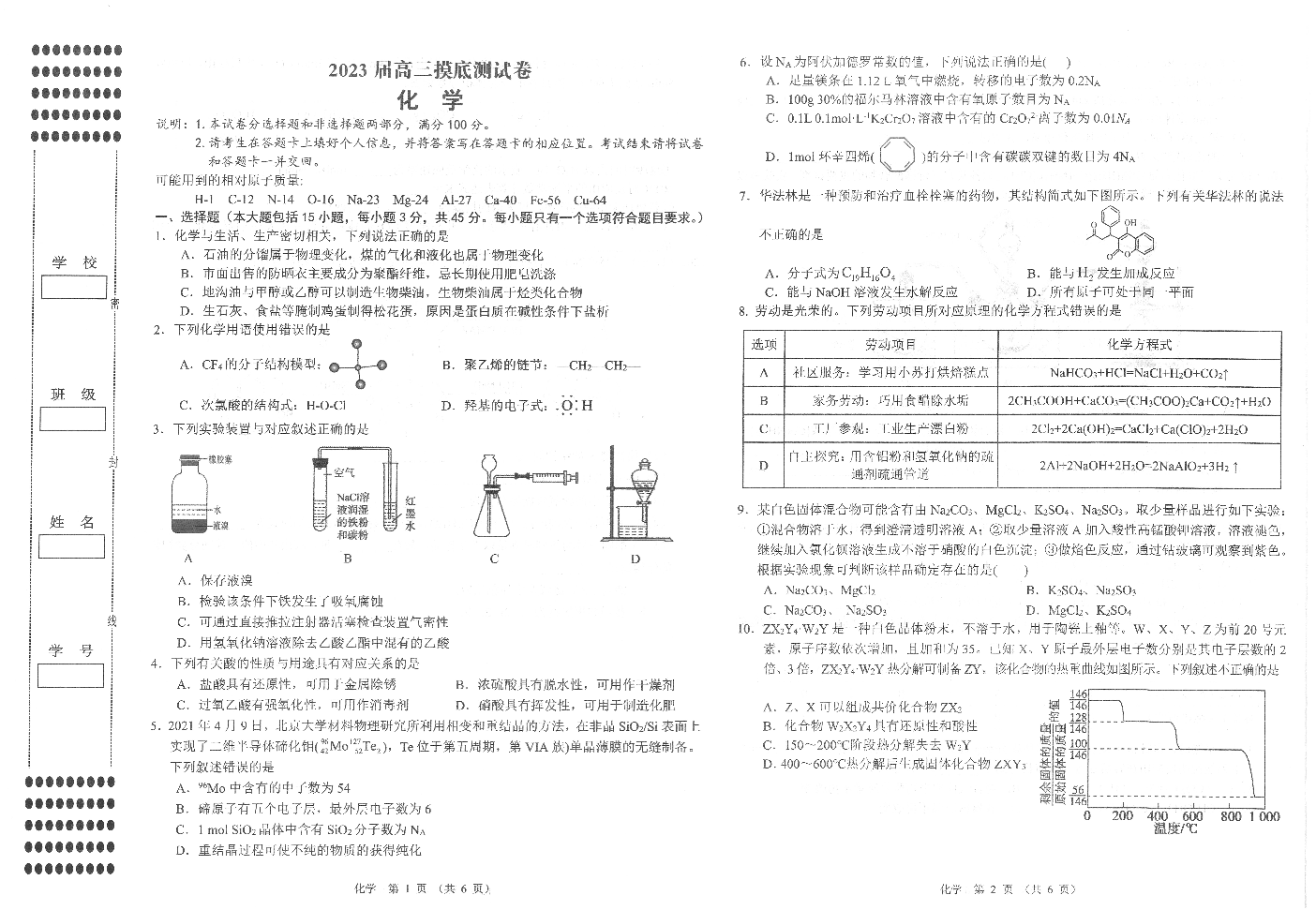 高三化学--江西省南昌市2023届高三摸底测试(零模)