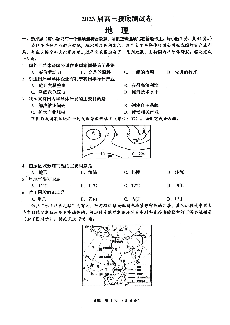 高三地理--江西省南昌市2023届高三摸底测试(零模)
