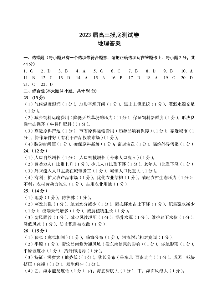 高三地理答案--江西省南昌市2023届高三摸底测试(零模)