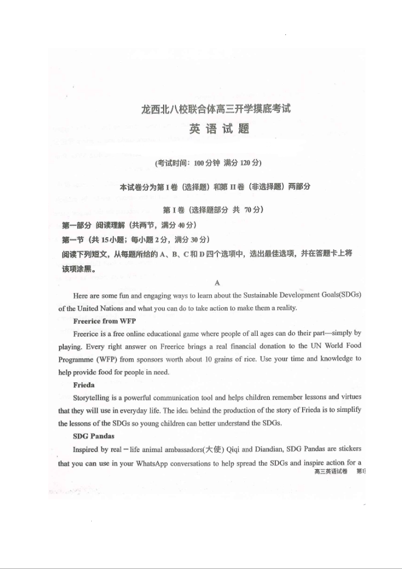 高三英语--黑龙江省龙西北八校联合体2023高三上学期开学考