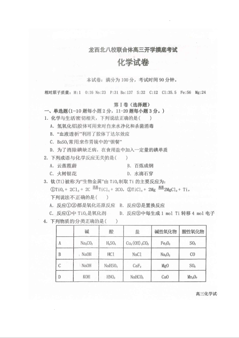 高三化学--黑龙江省龙西北八校联合体2023高三上学期开学考