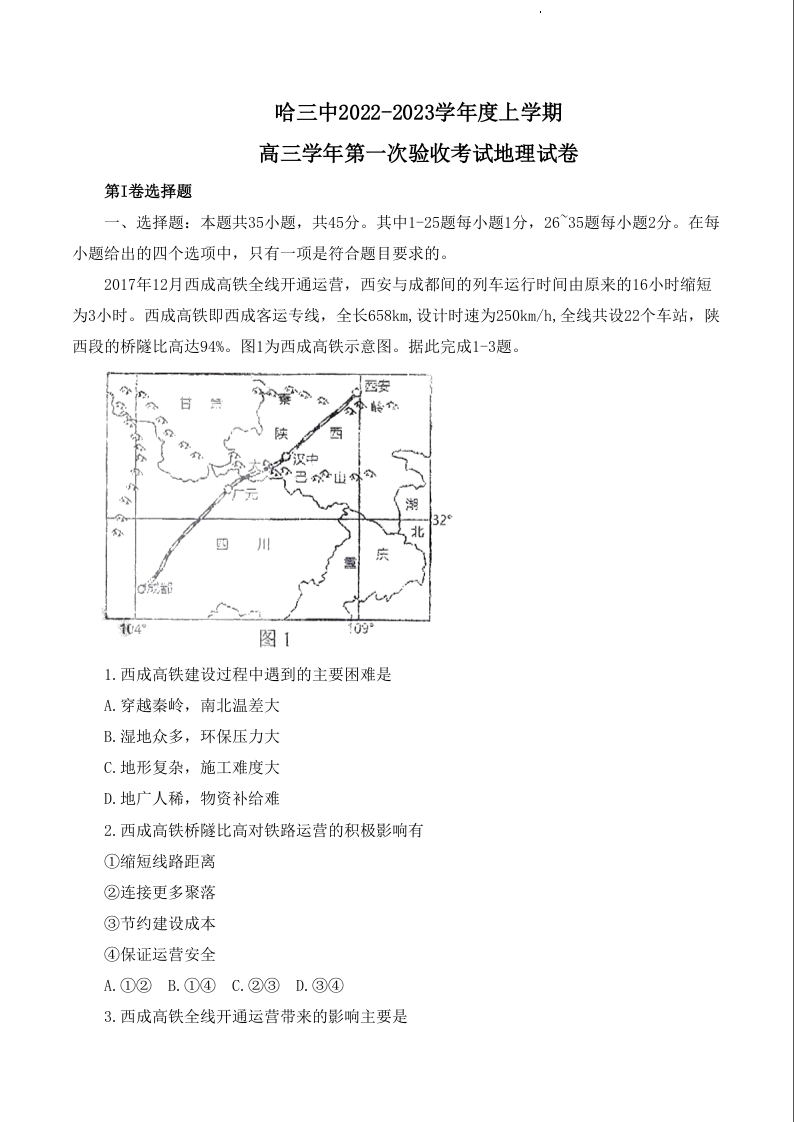 高三地理+答案--黑龙江省哈尔滨市第三中学校2022-2023学年高三上学期第一次验收考试