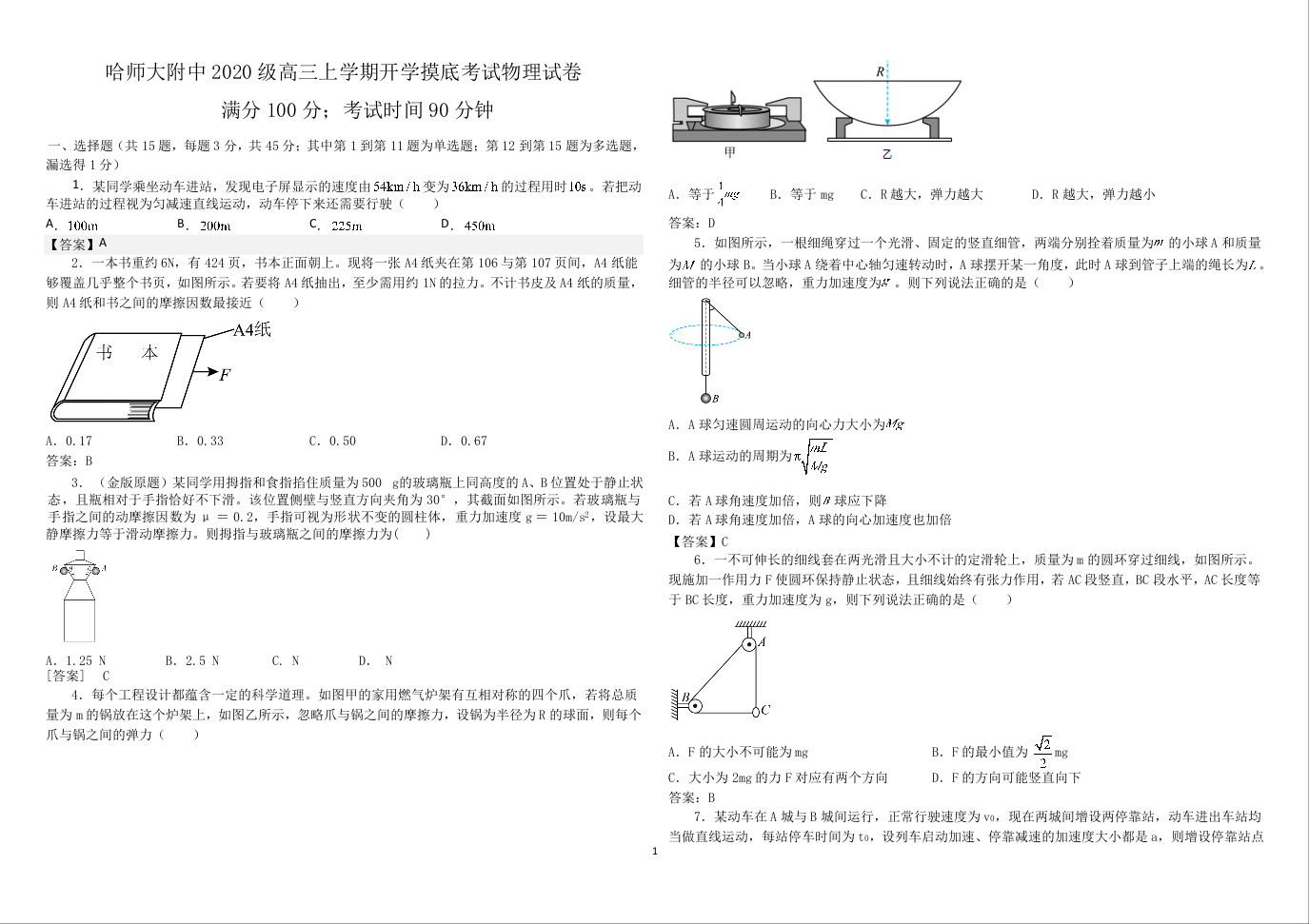 高三物理答案--黑龙江省哈尔滨师范大学附属中学2023高三9月月考