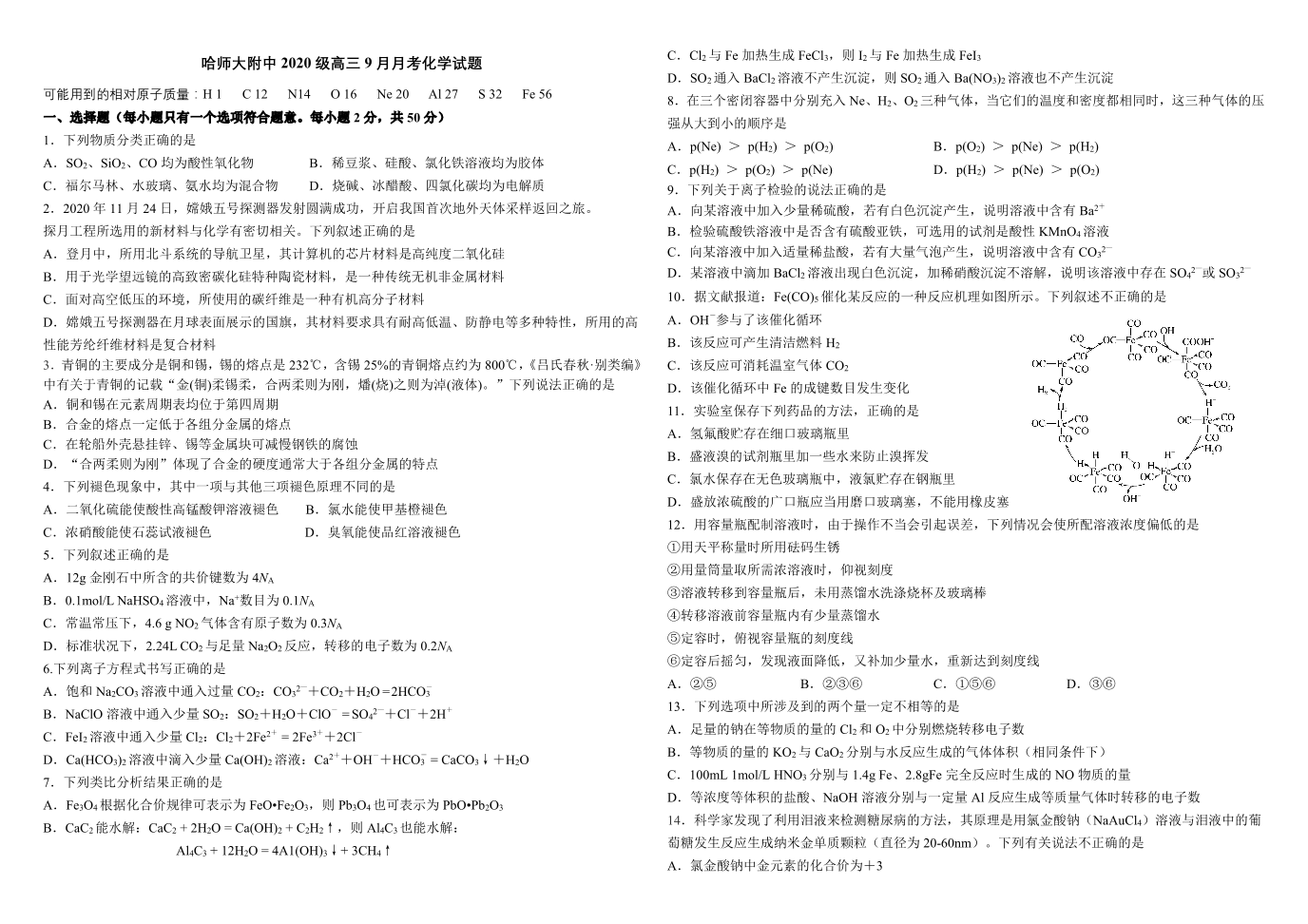 高三化学--黑龙江省哈尔滨师范大学附属中学2023高三9月月考