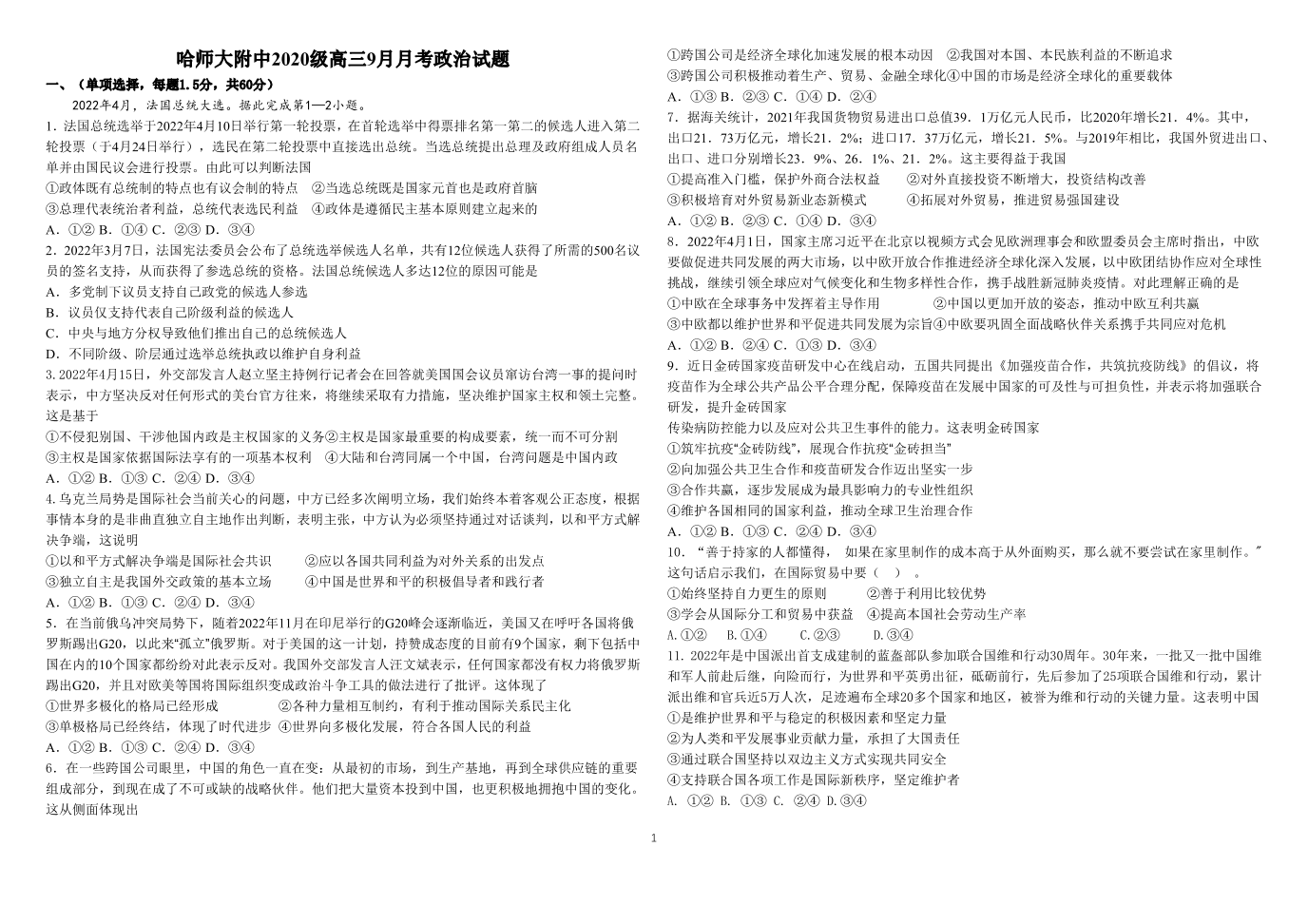 高三政治--黑龙江省哈尔滨师范大学附属中学2023高三9月月考
