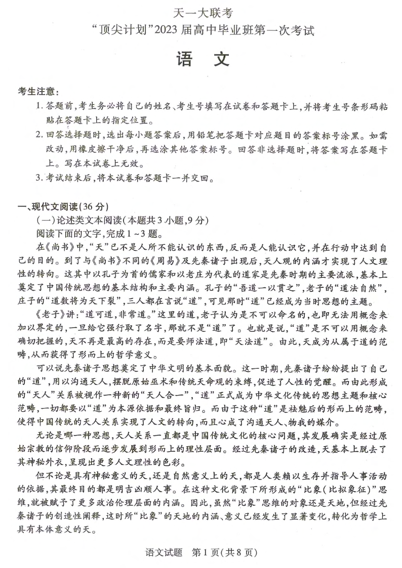 高三语文+答案--河南省十所名校高中毕业班尖子生2023届上学期第一次考试