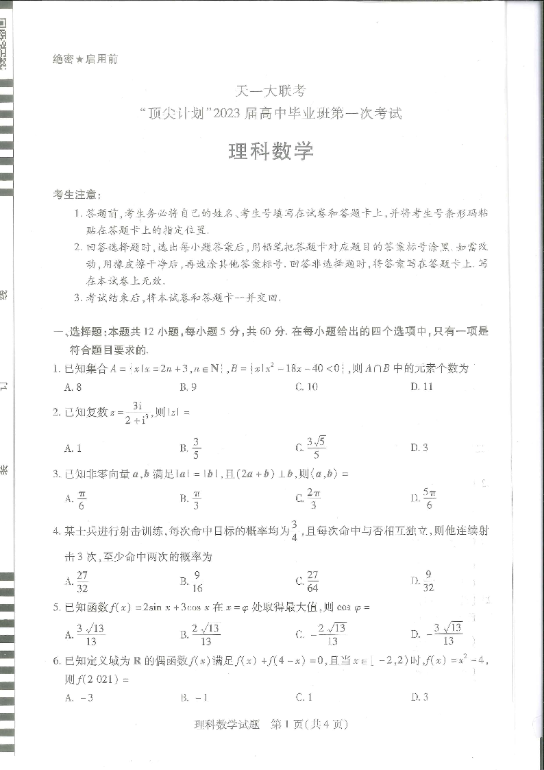 高三理数+答案--河南省十所名校高中毕业班尖子生2023届上学期第一次考试