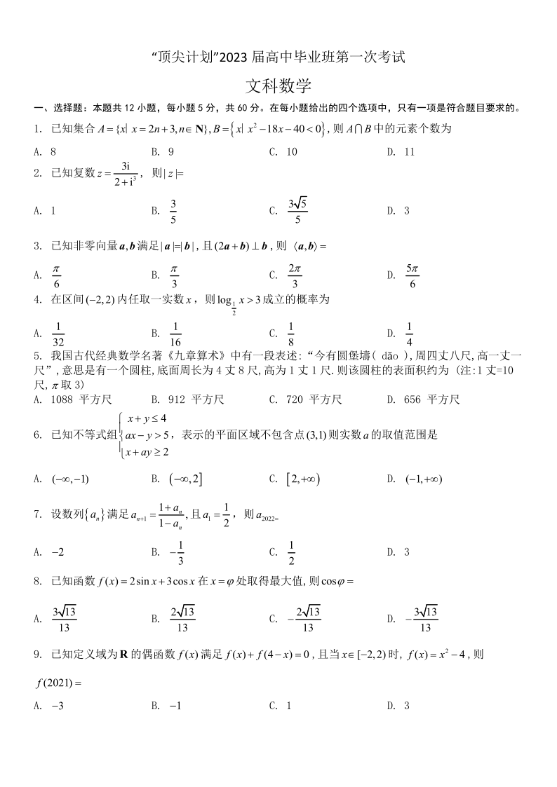 高三文数+答案--河南省十所名校高中毕业班尖子生2023届上学期第一次考试