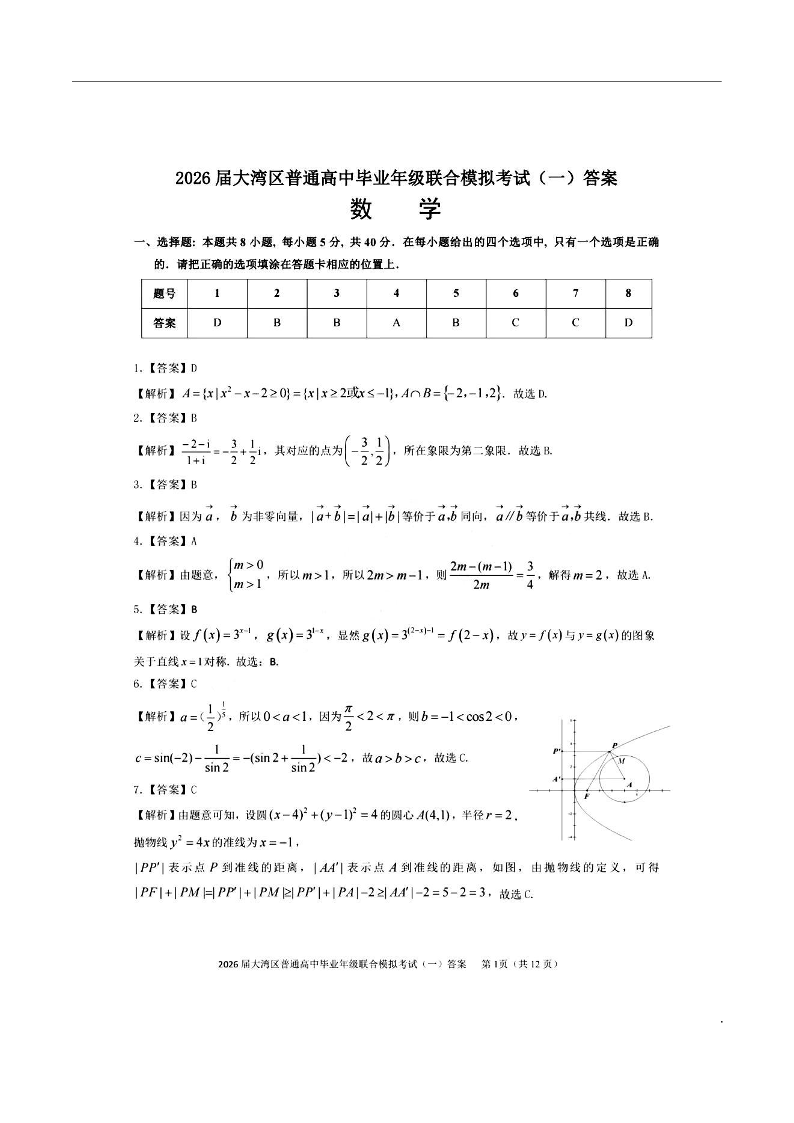 高三数学答案--广东省大湾区2026届普通高中毕业年级高三年级联合模拟考试(一)(大湾区一模)