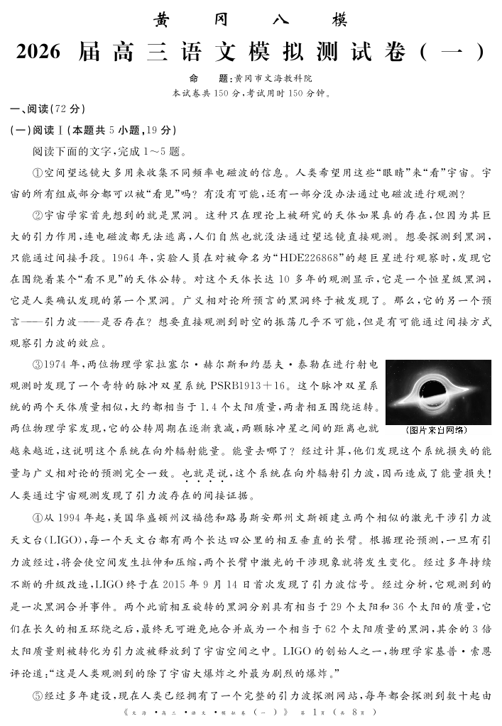 高三语文+答案--四川省黄冈八模2026届高三模拟测试卷(一)