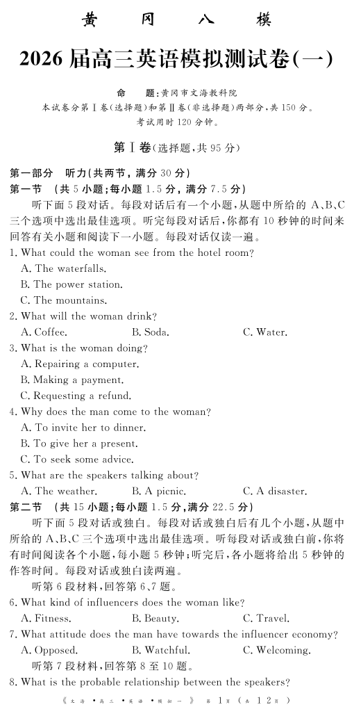高三英语+答案--四川省黄冈八模2026届高三模拟测试卷(一)
